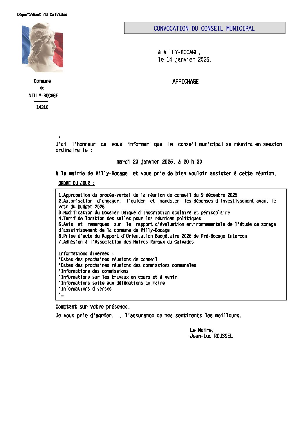 Conseil municipal mardi 20 janvier 2026 à 20h30